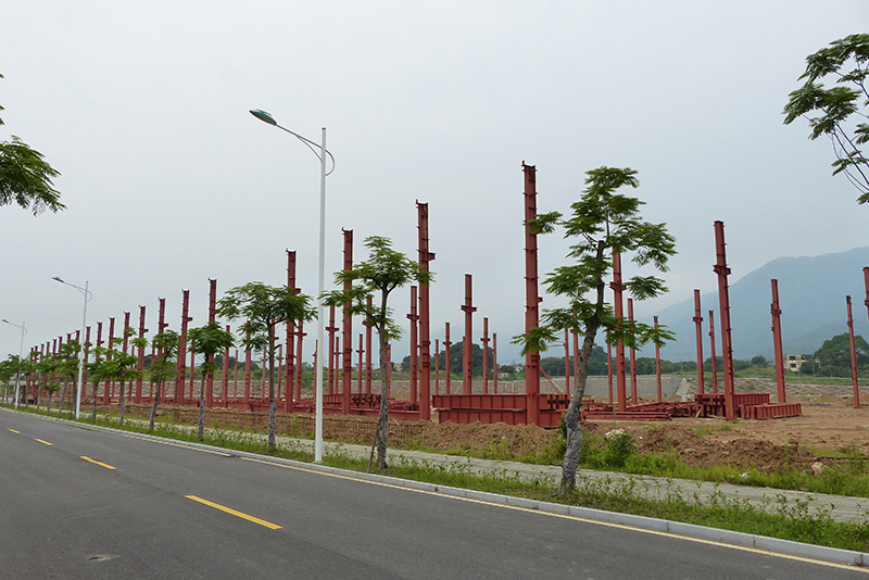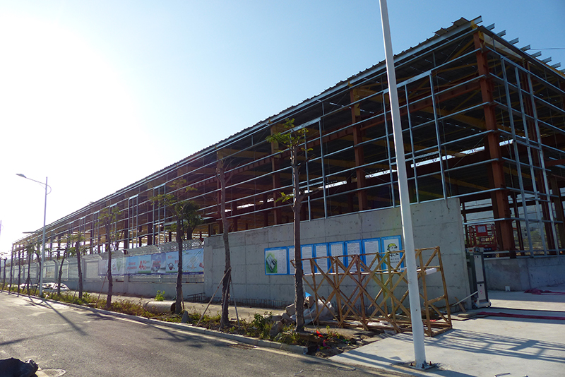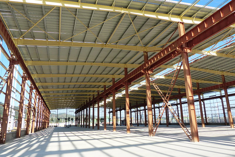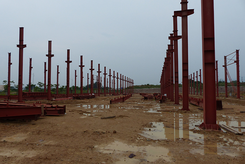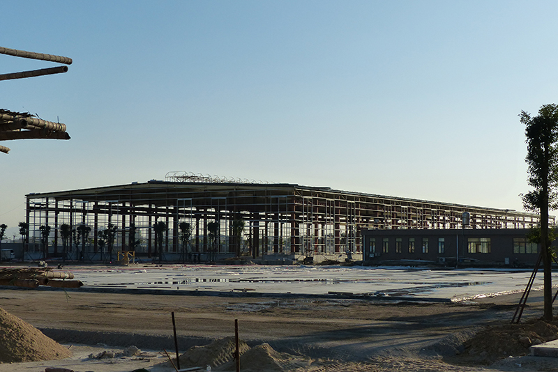 2016年12月9日,鋼結(jié)構(gòu)框架整體搭建完畢,進(jìn)入外墻及屋頂搭建,堆場(chǎng)也鋪設(shè)完成。